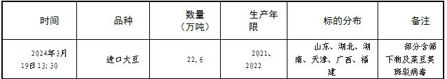 受中储粮油脂有限公司委托,2024年3月19日13:30在国家粮食和物资储备局粮食交易协调中心及联网的各省(区、市)国家粮食交易中心组织开展进口大豆竞价交易,请交易会员通过国家粮食交易中心官网()“用户中心”,登录国家粮食交易平台,在专场列表中选择“进口大豆竞价销售交易”参与交易。现就有关事项公告如下(重点提示内容详见加粗字体部分):